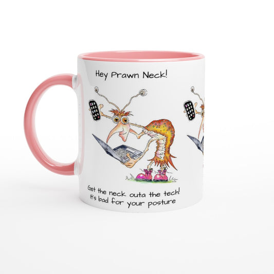 Hey Prawn Head. Keep the neck outa the tech. It's bad for your posture. White 11oz Ceramic Mug with Colour Inside