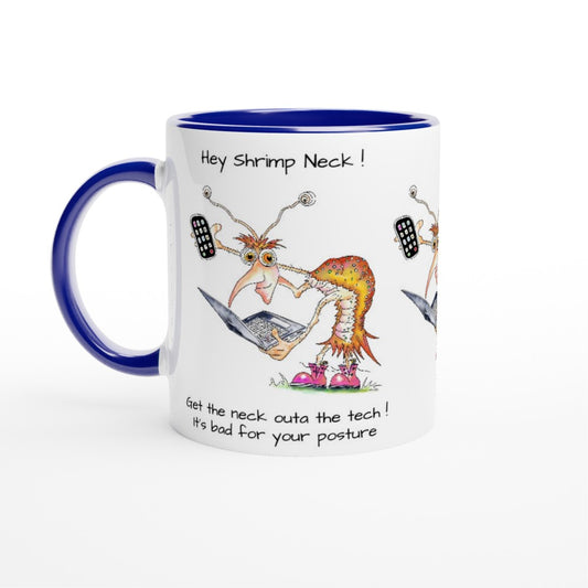 Hey Shrimp Neck. Keep your neck outa the tech. It's bad for your posture. White 11oz Ceramic Mug with Colour Inside