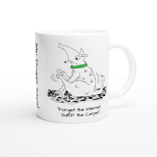 Humorous Printed Mug Mr Doggs says "Forget the Internet, SURF the Carpet"