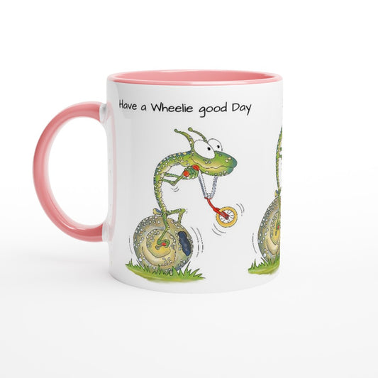 Have a Wheelie good Day. Graham the Snail Rides a Shell. White 11oz Ceramic Mug with Colour Inside